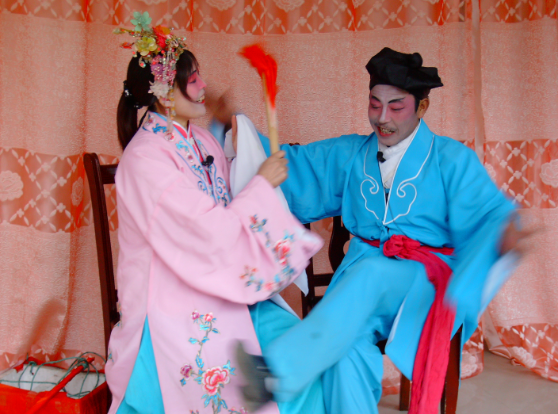 大筒子戲文、武場齊全。其角色有末角、生、老生、小生、老旦、正旦、小旦、彩旦、老丑、小丑;唱腔有小生調(diào)、老生調(diào)、老配少調(diào)、半板、板半、陰調(diào)、放哀子等七個調(diào)子。其中小生調(diào)為小生、小旦用,老生調(diào)為老生、老旦用,老配少調(diào)一般為老生、小生對唱時用。這些曲調(diào)的音樂句子結(jié)構(gòu)為上下句的對偶句,比較簡單,變化也很少,每段唱腔上下句的節(jié)數(shù)相等。曲調(diào)細膩纏綿、自由流暢,活潑性、跳躍性較大。