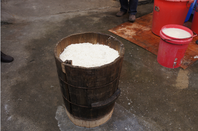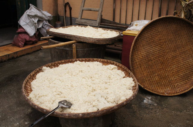 做稠酒的原料有糯米、水、酒曲,均產(chǎn)自當(dāng)?shù)亍J紫龋瑢⑴疵渍羰欤谀九杌蚱鸦@中攤開(kāi)、晾涼,加入適量甜酒曲拌勻,裝缸發(fā)酵13天,制成甜酒。然后,在制成的甜酒中加入適量小曲和涼開(kāi)水,攪拌均勻。再次,發(fā)酵。前幾天每天攪動(dòng)發(fā)酵物12次,待浮起來(lái)的糯米大部分沉下缸底后不再攪動(dòng),15天左右酒熟。