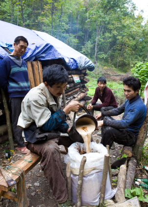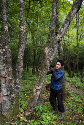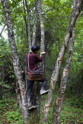 安康土漆采集是一項(xiàng)技術(shù)性很強(qiáng)的工作。在采集土漆過程中,第一要把握好采割的時(shí)間(農(nóng)歷五月初五放水,五月十五日開始割漆,5天為一周期,農(nóng)歷九月初九停刀)、溫度(14.5~30.8℃)、濕度(56~92%)、割口方向(一般用剪刀型,也有鯉魚型、單口型、刷把型、牛眼睛型)、割口數(shù)(一般的樹可割二十個(gè)口左右,大樹可割到四五十個(gè)口)、割漆頻率(割后三年為下次采割期)等條件。第二在收割采集土漆時(shí)要進(jìn)行辟路、上樹、打樁(捆樹)、刮皮、割口、掛筧子、接漆等一整套程序。每個(gè)環(huán)節(jié)都需要割漆人有熟練的技術(shù)和豐富的經(jīng)驗(yàn)積累,同時(shí)還要有強(qiáng)健的身體及充足的體力。