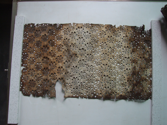 制作藍(lán)印花布的工藝流程很復(fù)雜。首先從蓼藍(lán)草中提取藍(lán)作染料(靛藍(lán)),把鏤空花版鋪在白布上,用刮漿板把防染漿劑刮入花紋空隙漏印在布面上,干后放入染缸,將布放入缸中浸染20分鐘,而后取出氧化、透風(fēng)30分鐘,一般經(jīng)過68次反復(fù)染色,直到達(dá)到所需顏色為止。再將其拿出,放在空氣中氧化,晾干后刮去防染漿粉,即顯現(xiàn)出藍(lán)白花紋。因?yàn)槭侨止び∪荆珊蟮臐{不免會有裂紋,形成手工藍(lán)印花布特有的魅力——冰裂紋。