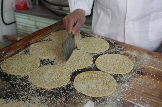 炕炕饃有咸甜兩種口味。其形似滿月,碗口大小約1厘米厚,邊厚中薄者謂之“圓炕炕”,長形若神牌者謂之“長炕炕”。炕炕上面粘滿芝麻,一面有芝麻的謂之“一面麻”,兩面均有芝麻的謂之“二面麻”。餅上面每間隔指許,剁有似斷非斷的一道道刀印,一為烘焙過程中餅胚脫水后不變形,烤出的成品美觀;二為在食用過程中便于掰開,減少浪費、方便食用。