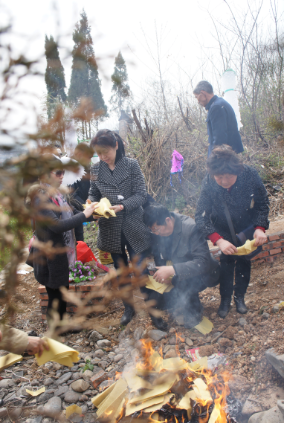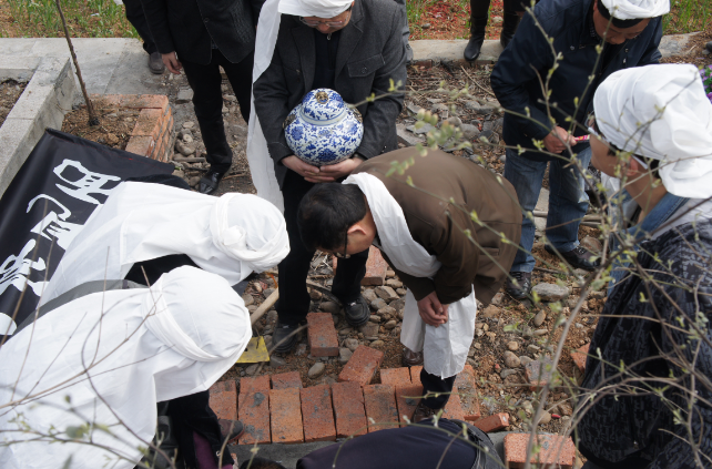 出殯時(shí)由孝長子打“開路碗”起靈,男孝靈前拉纖,女孝其后送靈。靈柩以雙木杠捆扎,蓋棺罩,16人抬靈,山區(qū)為4人抬,抬喪不問路,踩壞莊稼、折斷樹是無人怪罪的。出殯沿途撒紙錢,路口放鞭炮,吹吹打打送亡靈上山。孝子跪在靈前,請(qǐng)求抬靈人能將亡者平安送上山。頭日,靈柩抬至墓地,男孝至墓地下壙,以五谷撒棺蓋,看陰陽人按羅盤定位,壅土葬埋。次日,孝子給送葬者叩頭“謝孝”。三日?qǐng)A墳,喪葬結(jié)束。