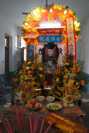 靈堂對(duì)聯(lián)多為“日落西山常見面,水流東海不回頭”,男亡則橫批曰“當(dāng)大事”,女亡則橫批曰“音容宛在”。兩旁供桌上放置靈牌,男孝穿孝袍,腰系草繩,女孝纏孝帕,穿孝衫,圍孝裙, 以示哀悼。