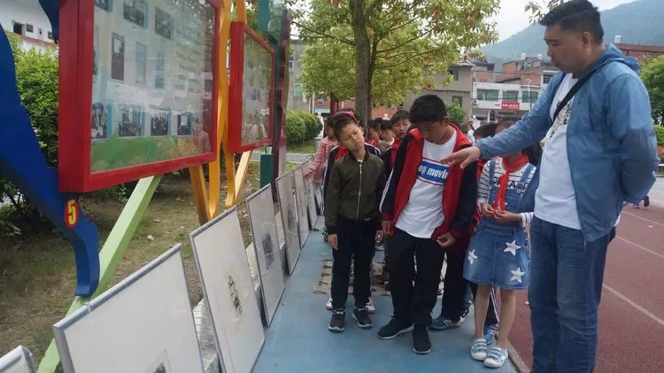 操場上孩子們有序的參觀兒童版畫作品,劉老師耐心的給孩子們講解。