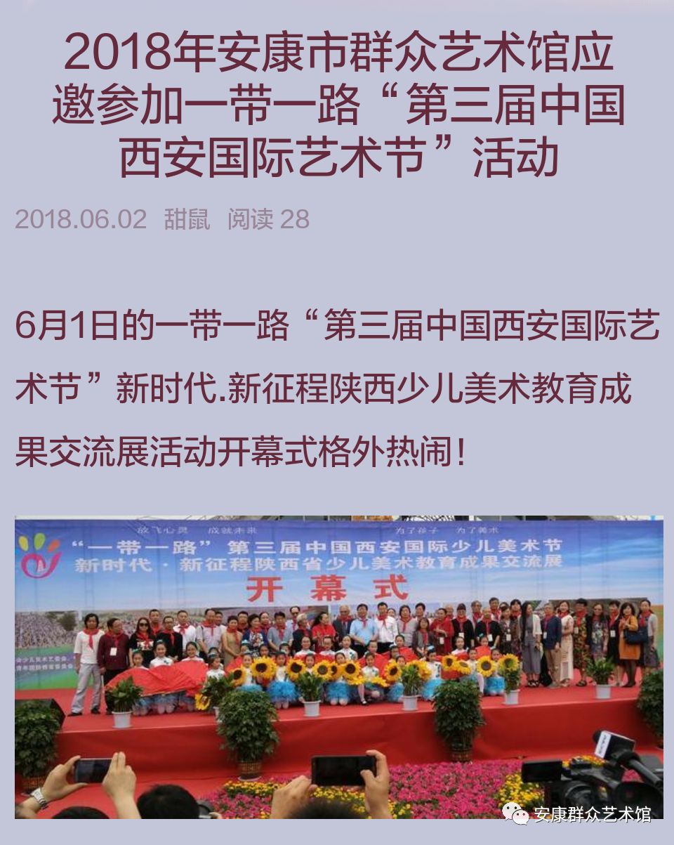 童年是初生的綠葉,童年是含苞的花蕾,童年是一片藍(lán)藍(lán)的天,童年是充滿美麗的夢幻。六月一日上午,“一帶一路”第三屆中國西安國際少兒美術(shù)節(jié)在西安國際美術(shù)城拉開帷幕。安康市群眾藝術(shù)館派出馬孟剛和劉曉東二位美術(shù)干部參加了此次少兒美術(shù)教育成果交流展。今天小編刊發(fā)劉曉東老師所發(fā)美篇截圖,帶給大家不一樣的精彩!