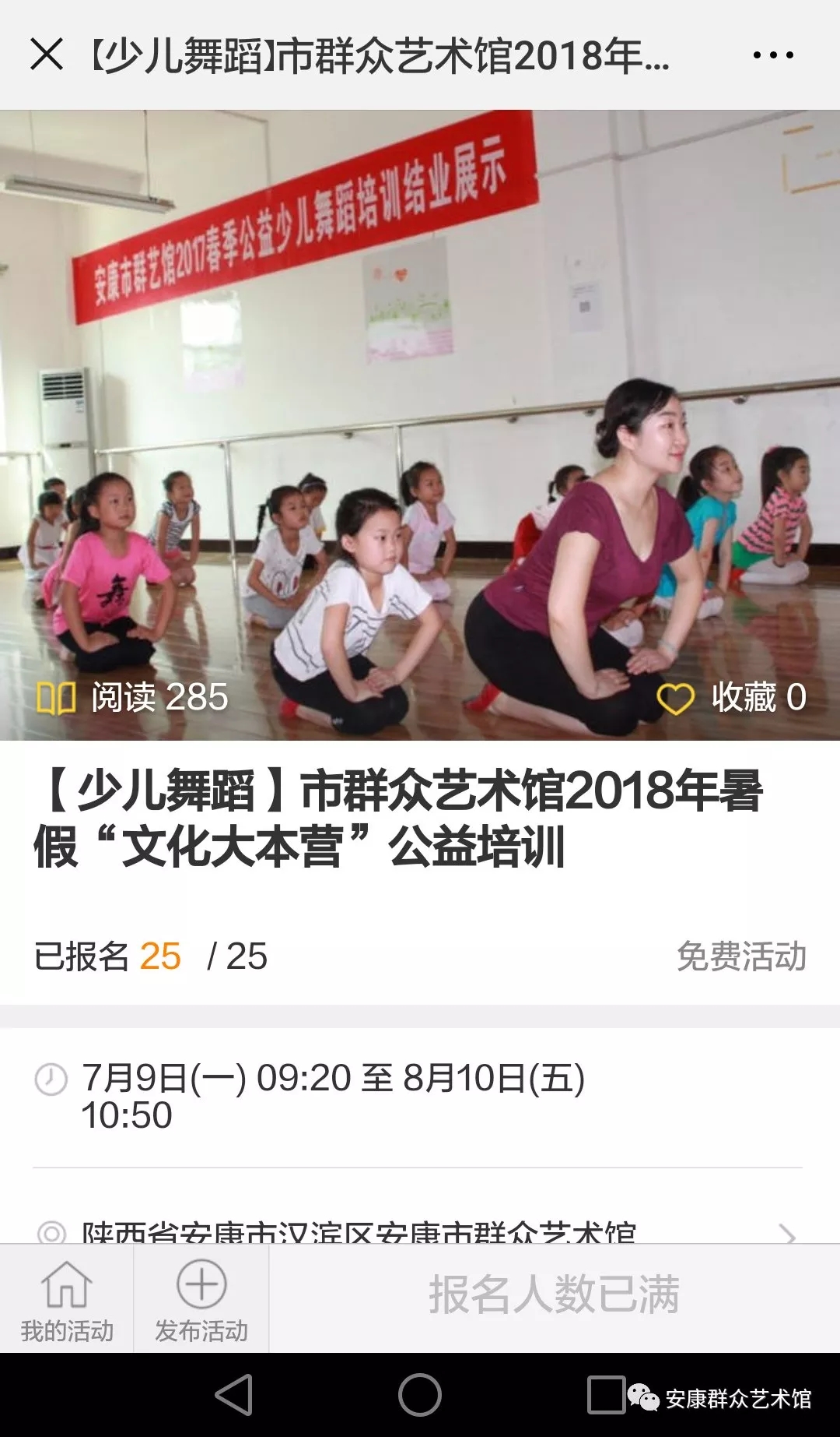 據(jù)悉,為進(jìn)一步弘揚(yáng)中華民族傳統(tǒng)文化,豐富青少年的暑期生活,深入推進(jìn)安康中心城區(qū)“文化大本營”工程實(shí)施,進(jìn)一步提升群藝館免費(fèi)開放服務(wù)質(zhì)量水平,滿足群眾多樣化的文化需求,安康市群眾藝術(shù)館從7月9日至8月10日的開辦少兒舞蹈、少兒美術(shù)、少兒書法、少兒吉他、少兒國際標(biāo)準(zhǔn)舞、少兒歌手、少兒拉丁舞公益培訓(xùn)。此次培訓(xùn)受到轄區(qū)群眾熱捧,在報名系統(tǒng)開通一小時后,各培訓(xùn)班均因名額滿員自動關(guān)閉報名系統(tǒng)。
