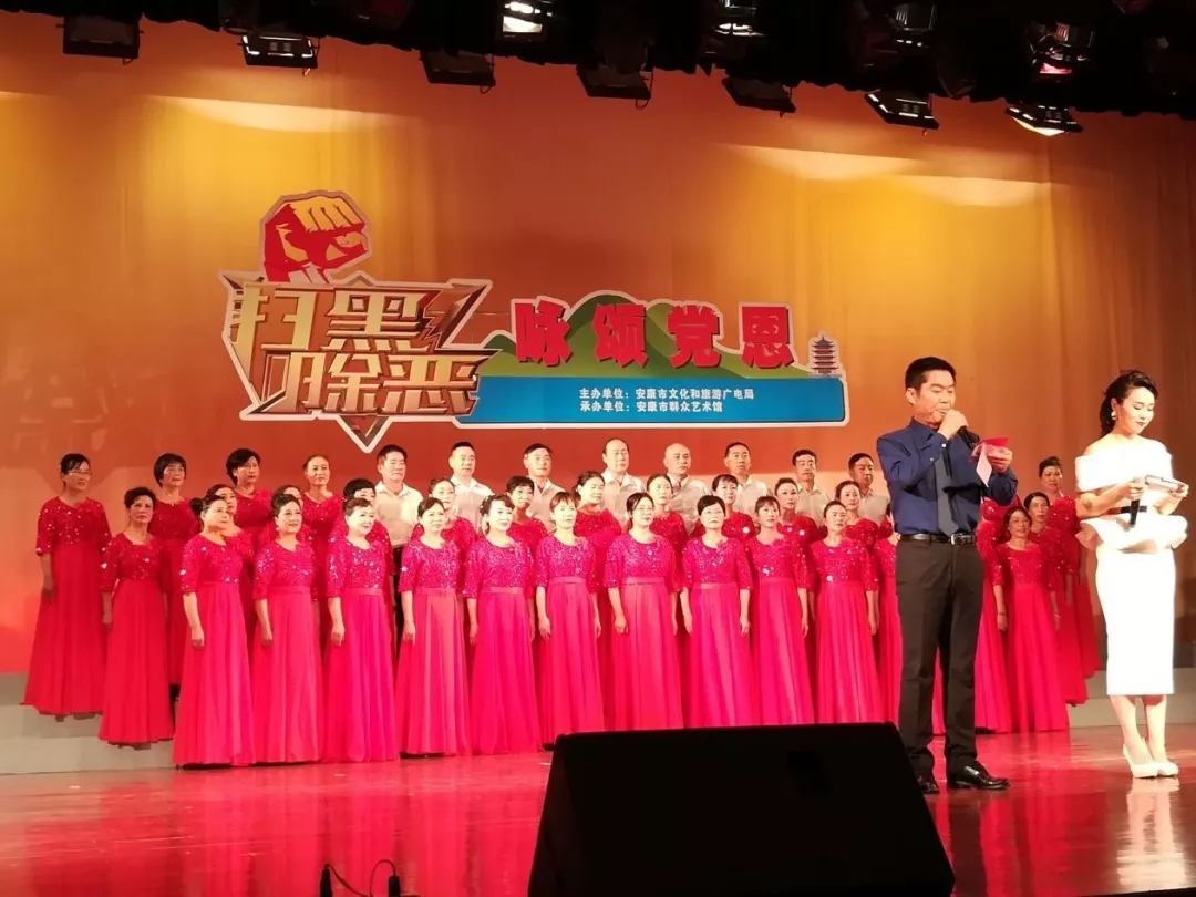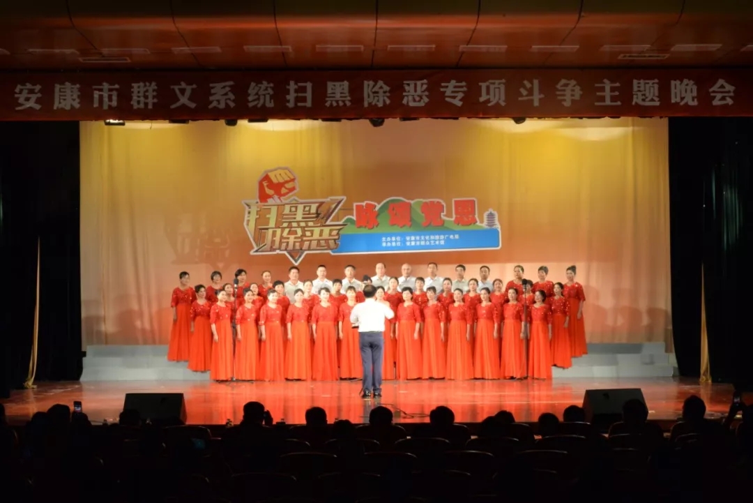 晚會在大合唱《掃黑除惡安康在行動》雄壯、鏗鏘的旋律中拉開帷幕。