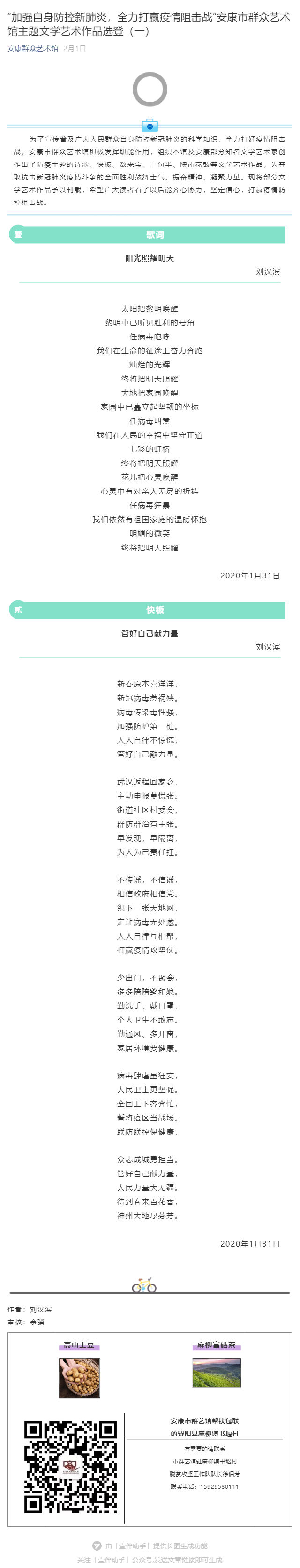“加強(qiáng)自身防控新肺炎,全力打贏疫情阻擊戰(zhàn)”安康市群眾藝術(shù)館主題文學(xué)藝術(shù)作品選登(一)
