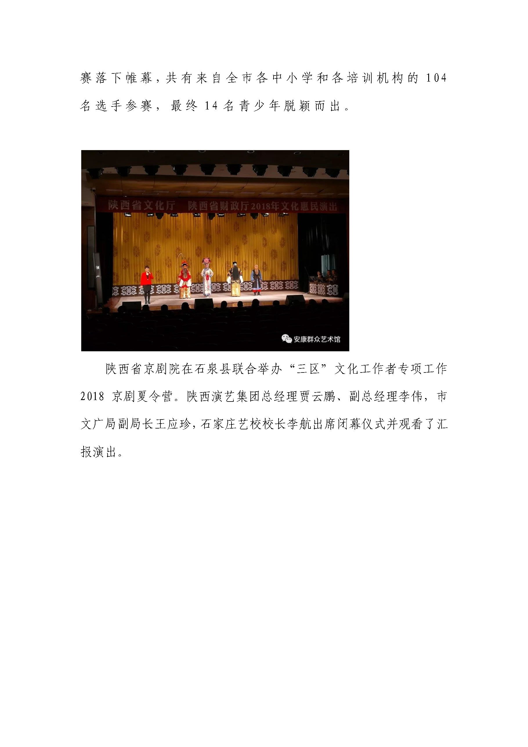 2、與陜西省京劇院在石泉縣聯(lián)合舉辦“三區(qū)”文化工作者專項(xiàng)工作2018京劇夏令營(yíng)。陜西演藝集團(tuán)總經(jīng)理賈云鵬、副總經(jīng)理李偉,市文廣局副局長(zhǎng)王應(yīng)珍,石家莊藝校校長(zhǎng)李航出席閉幕儀式并觀看了匯報(bào)演出。